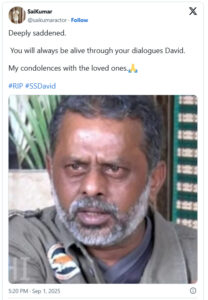 ನಟ ಸಾಯಿ ಕುಮಾರ್ ಎಕ್ಸ್ನಲ್ಲಿ ಪೋಸ್ಟ್ ಮಾಡಿ ಸಂತಾಪ ಸೂಚಿಸಿದ್ದಾರೆ. ‘ತೀವ್ರವಾಗಿ ದುಃಖಿತನಾಗಿದ್ದೇನೆ. ನಿಮ್ಮ ಸಂಭಾಷಣೆಗಳ ಮೂಲಕ ನೀವು ಯಾವಾಗಲೂ ಜೀವಂತವಾಗಿರುತ್ತೀರಿ, ಡೇವಿಡ್. ಪ್ರೀತಿಪಾತ್ರರಿಗೆ ನನ್ನ ಸಂತಾಪಗಳು… #RIP #SSDavid’ ಎಂದು ಬರೆದಿದ್ದಾರೆ.