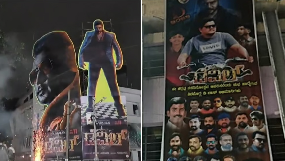 ಬೆಂಗಳೂರಿನ ನವರಂಗ ಚಿತ್ರಮಂದಿರದ ಮುಂಭಾಗ ಪಟಾಕಿ ಸಿಡಿಸಿ, ಬೃಹತ್ ಮೂರು ಕಟೌಟ್ ಹಾಕುವ ಮೂಲಕ ಅಭಿಮಾನಿಗಳು ಸಂಭ್ರಮಿಸಿದ್ದಾರೆ.