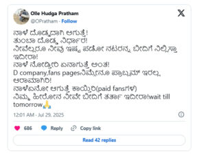 ಇದಕ್ಕೆ ತಿರುಗೇಟು ನೀಡಿರುವ ನಟ ಪ್ರಥಮ್, ‘ನಾಳೆ ದೊಡ್ಡದಾಗಿ ಅಗುತ್ತೆ! ತುಂಬಾ ದೊಡ್ಡ ನಿರ್ಧಾರ! ನೀವೆಲ್ಲರೂ ನೀವು ಇಷ್ಟ ಪಡೋ ನಟರನ್ನ ಬೀದಿಗೆ ನಿಲ್ಲಿಸ್ತಾ ಇದೀರಾ! ನಾಳೆ ನೋಡ್ತೀರಿ ಏನಾಗುತ್ತೆ ಅಂತ! D company, fans pages ನಿಮ್ಗೇನೂ ಪ್ರಾಬ್ಲಮ್ ಇರಲ್ಲ ಆರಾಮಾಗಿರಿ! ನಾಳೆ ಏನೋ ಆಗುತ್ತೆ ಕಾಯ್ತಿರಿ (paid fansಗಳ) ನಿಮ್ಮ ಹೀರೋನ ನೀವೇ ಬೀದಿಗೆ ತರ್ತಾ ಇದೀರಾ! ಎಂದು ಟ್ವೀಟ್ ಮಾಡಿದ್ದಾರೆ.